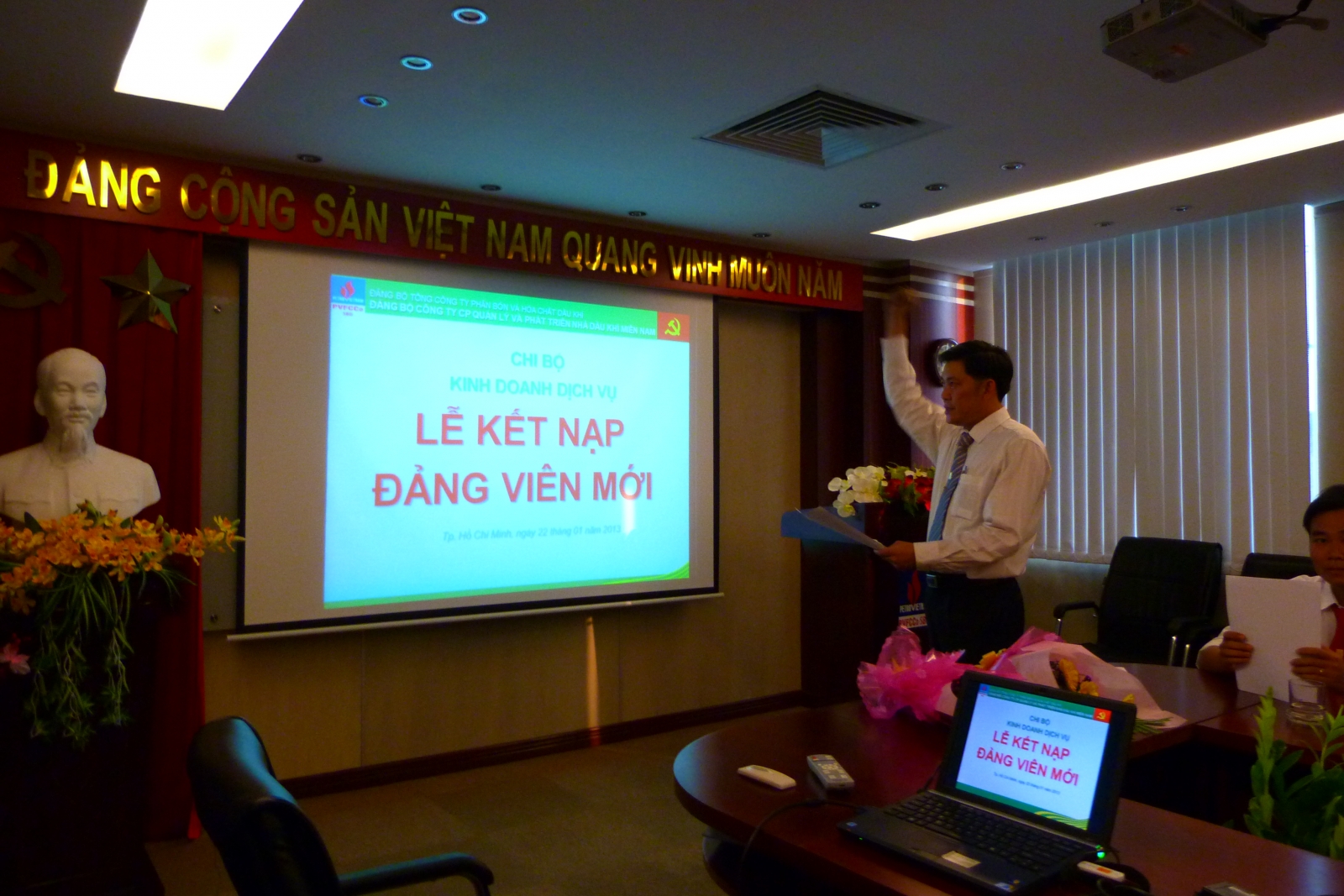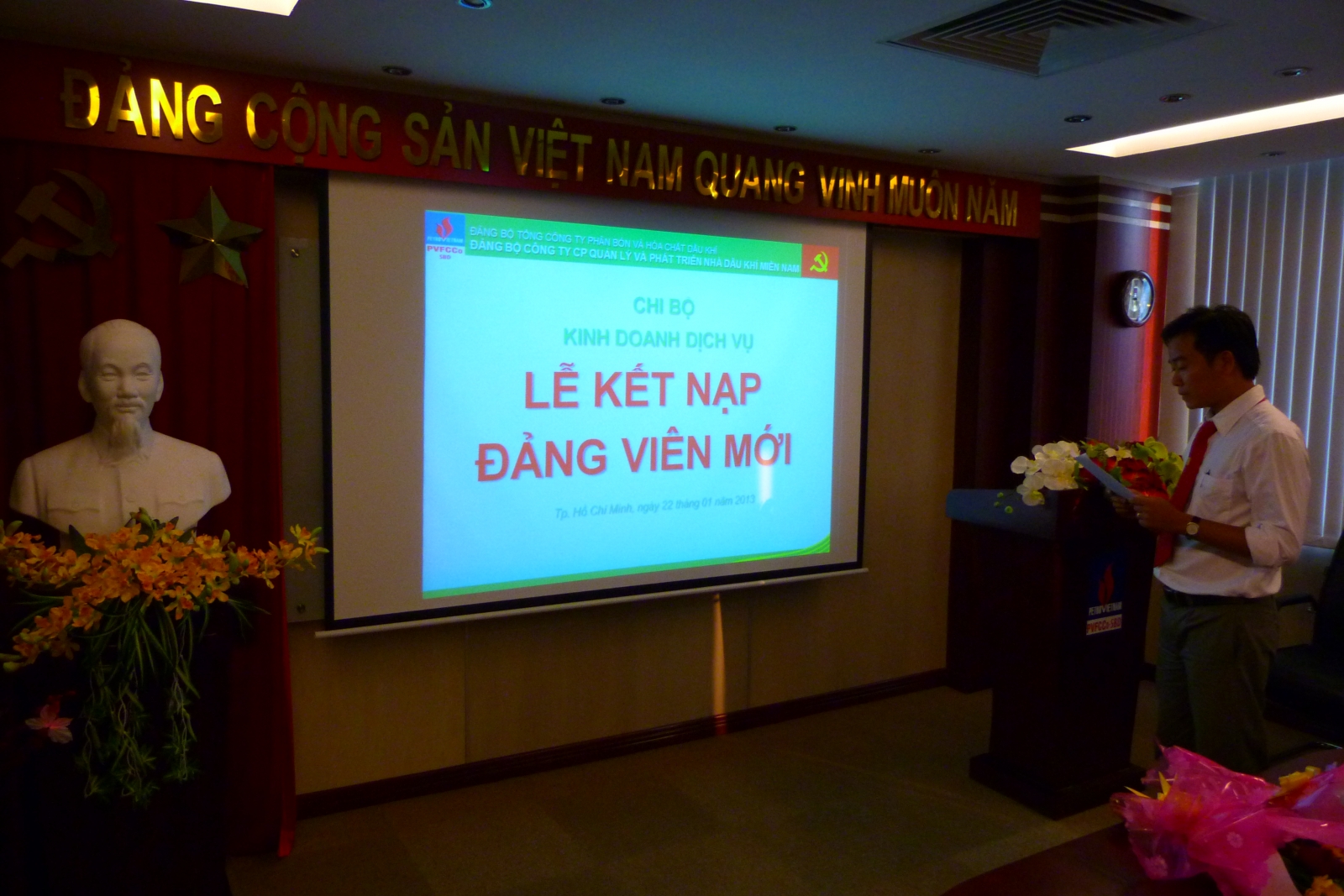 Ngày 22/01/2013, Chi bộ Dịch vụ Kho vận – trực thuộc Đảng uỷ Công ty Cổ phần Quản lý và Phát triển nhà Dầu khí Miền Nam (PVFCCo-SBD) đã tổ chức “Lễ kết nạp Đảng viên mới” cho 2 quần chúng ưu tú là Nguyễn Anh Tú và Lê Văn Điện. Đến dự buổi lễ có đồng chí Trần Văn Đào – Bí thư Đảng uỷ – Chủ tịch HĐQT Công tycùng toàn thể các đồng chí đảng viên thuộc Chi bộ Dịch vụ Kho Vận.